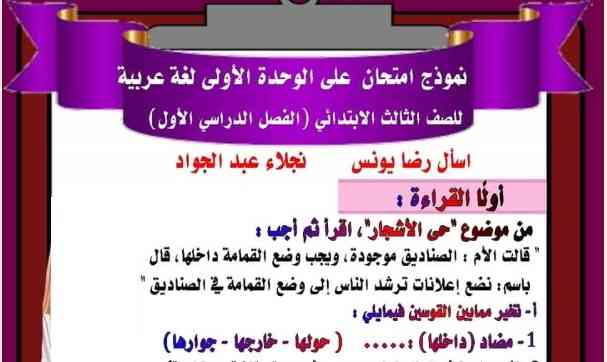 امتحان لغة عربية على الوحدة الأولى بنموذج الإجابة للصف الثالث الابتدائي ترم أول 2019