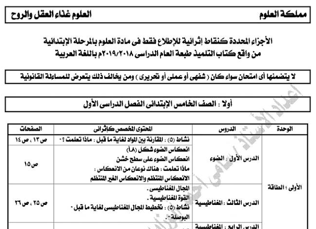 الدروس الملغية للعلوم للصف الرابع والخامس والسادس الابتدائى 2019