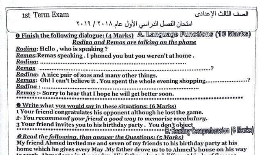 مراجعة ليلة الامتحان وبنك الاسئلة المتوقعه فى اللغة الانجليزية ثالثة اعدادى ترم اول 2019 الامتحان التعليمى