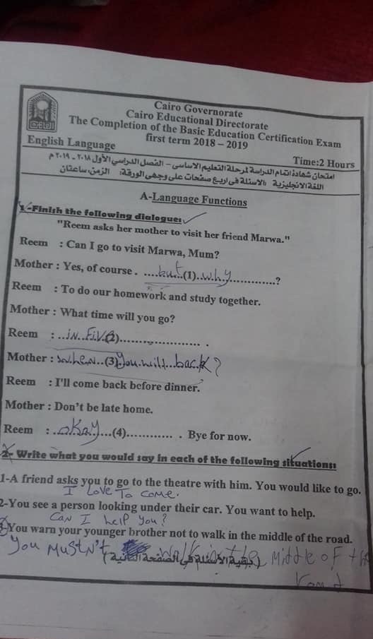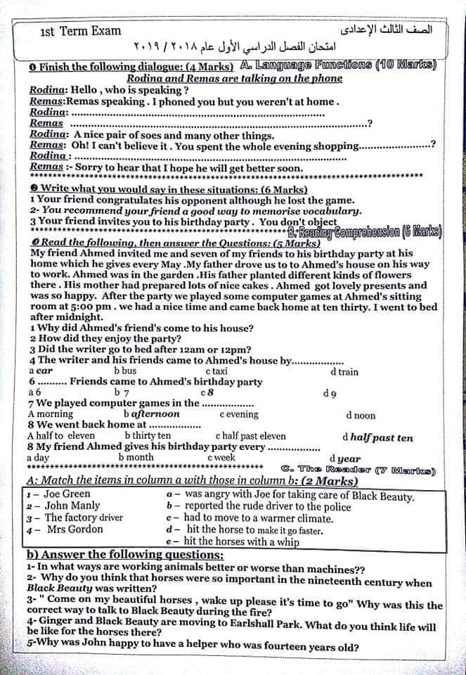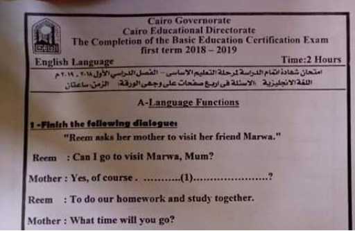 امتحان اللغة الانجليزية للصف الثالث الإعدادي ترم أول 2019 محافظة القاهرة