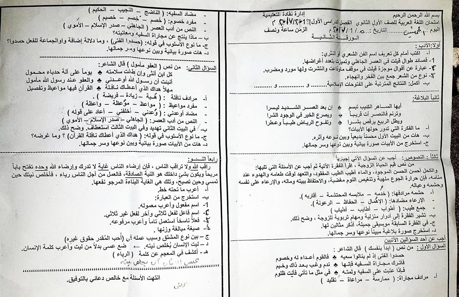 ورقة امتحان اللغة العربية الفعلية للصف الاول الثانوى الترم الاول 2017 ادارة نقادة