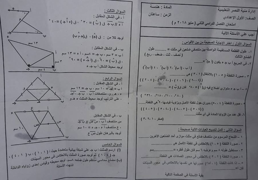 ورقة امتحان الهندسة للصف الاول الاعدادى ترم ثانى 2017 محافظة الاقصر