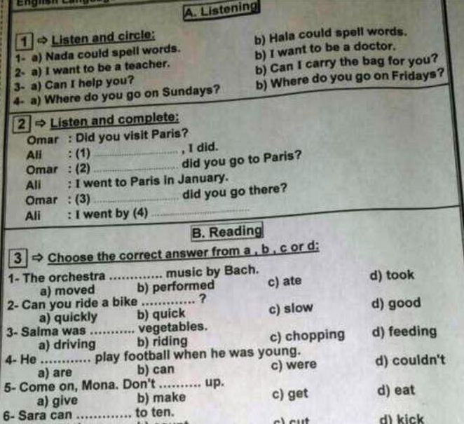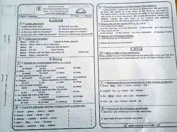 ورقة امتحان اللغة الانجليزية للسادس الابتدائى ترم ثانى 2017 تم امتحانة فعلا محافظة الشرقية English Test Papers Sixth Grade English Test