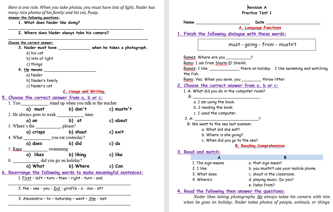امتحانات الصف السادس الابتدائى الترم الاول لغة انجليزية 2017