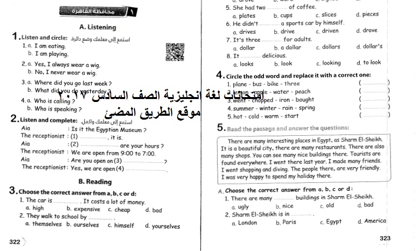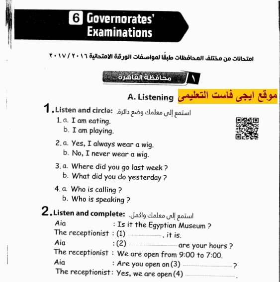 امتحان نصف العام النهائى فى اللغة الإنجليزية الصف السادس الابتدائى محافظة القاهرة 2017