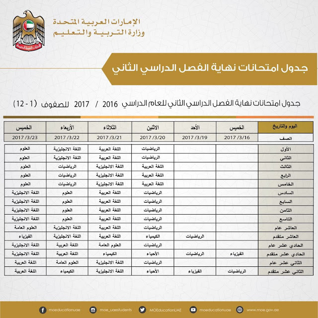 جدول امتحانات الفصل الثاني في الامارات 2016 2047 من الصف الاولي حتي الثاني عشر وزارة التربية والتعليم في الامارات تعلن عن جدول امتحانات الفصل الدراسي الثاني 2016 2017 لكل الصفوف من 1 12.