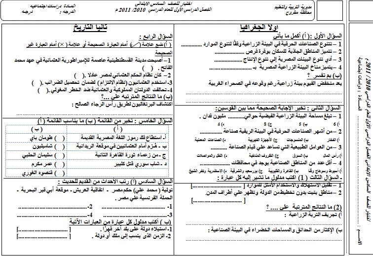 امتحان الدراسات الإجتماعية للصف السادس الابتدائى لنصف العام 2010 2011 بمحافظة مطروح