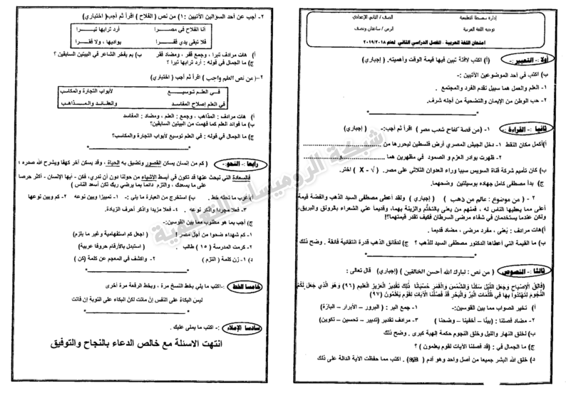 امتحان اللغة العربية للصف الثانى الاعدادى الترم الثانى 2019