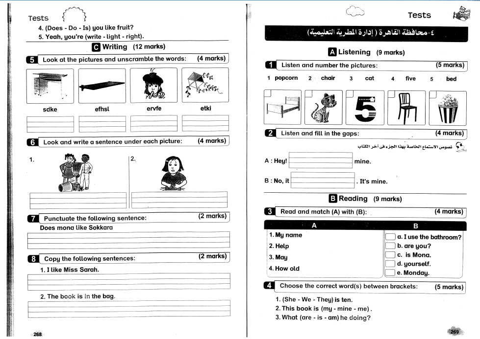 امتحان انجليزي للصف الثالث الابتدائي الفصل الثاني 2017