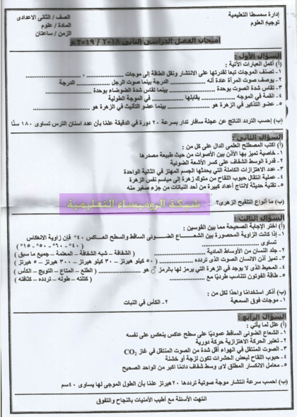 امتحان علوم للصف الثاني الإعدادي الدور الثاني 2019 بنموذج الإجابة منسق جاهز للتحميل والطباعة