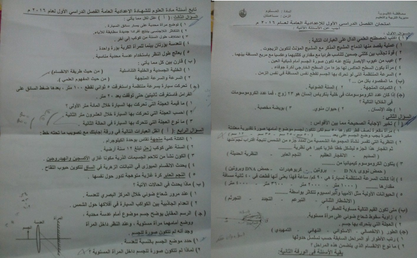 محافظة الاسكندرية امتحان العلوم للصف الثالث الإعدادى ترم ثان 2016
