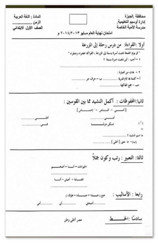 نموذج امتحان لغة عربية اولى ابتدائى ترم طالب