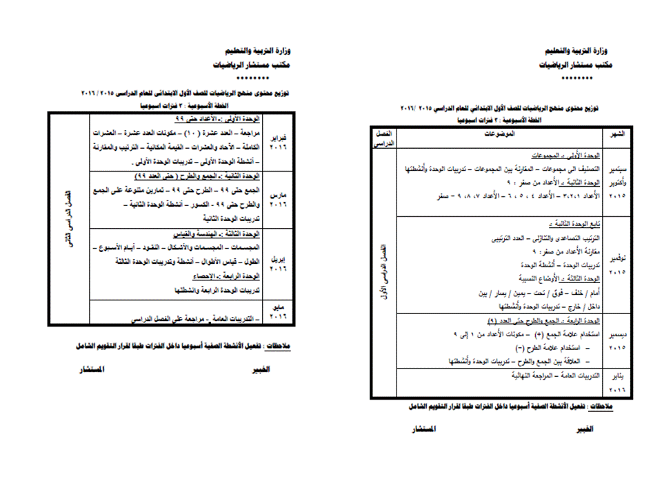 ننشر توزيع منهج الرياضيات للمرحلة الابتدائية للعام 2015 2016