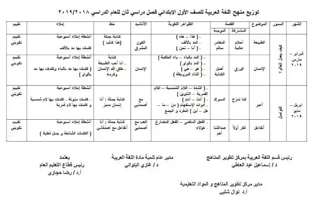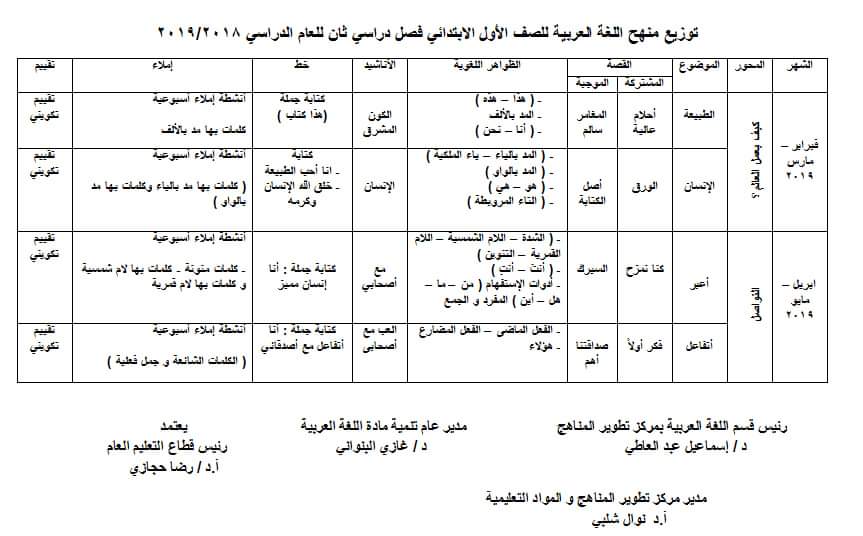 توزيع منهج اللغة العربية للصف الأول الإبتدائى منهج الترم الثانى 2019