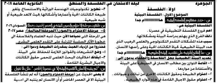 توقعات امتحان الفلسفة والمنطق بالإجابات للثانوية العامة 2018