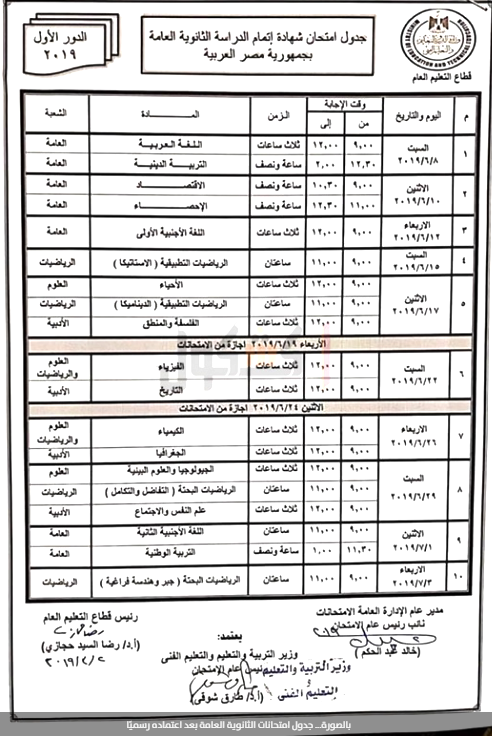 متاح هنا جدول الثانوية العامة 2019 النهائي بعد إعتماده رسميا من قبل وزير التربية والتعليم كلمة دوت أورج