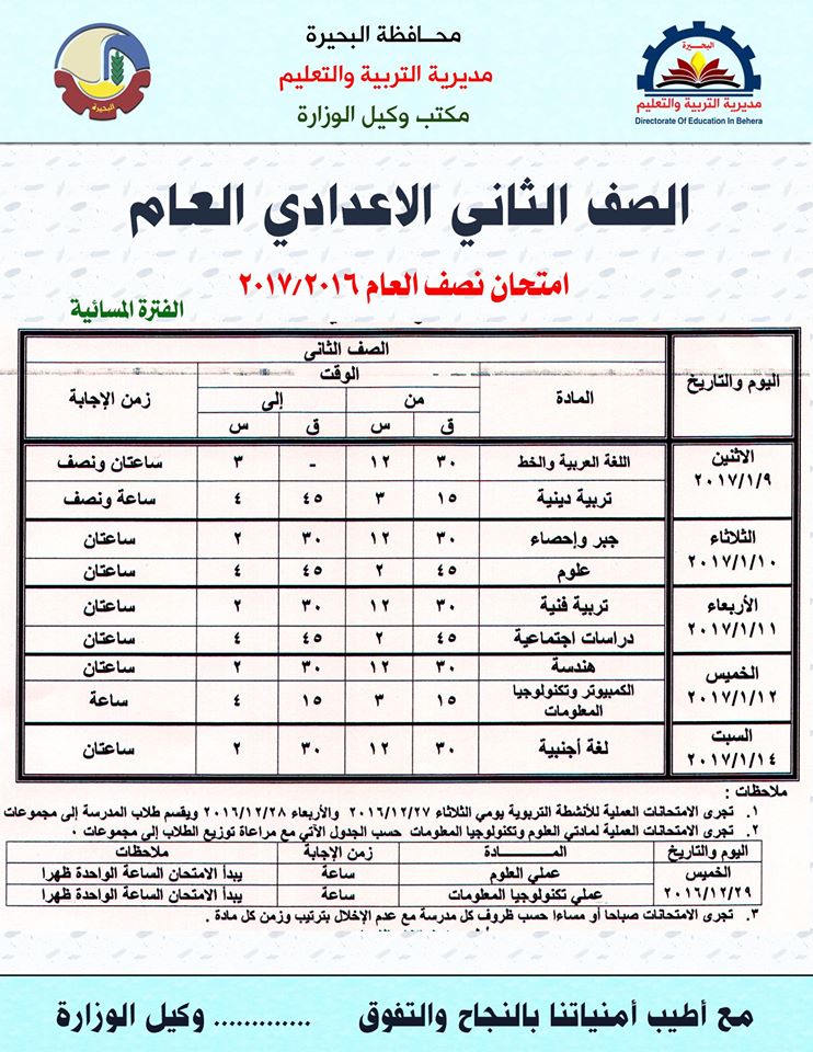 بالصور جداول امتحانات محافظة البحيرة لجميع المراحل للعام 2016 2017 الفصل الدراسي الاول