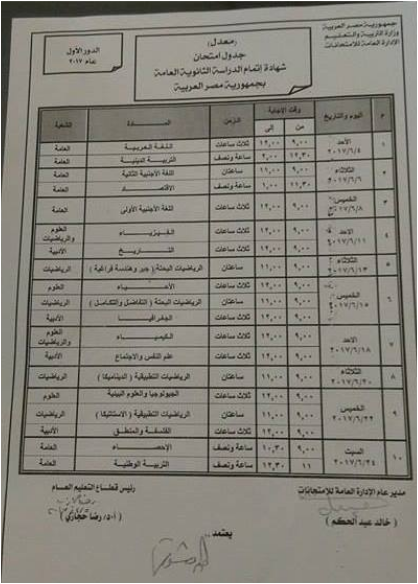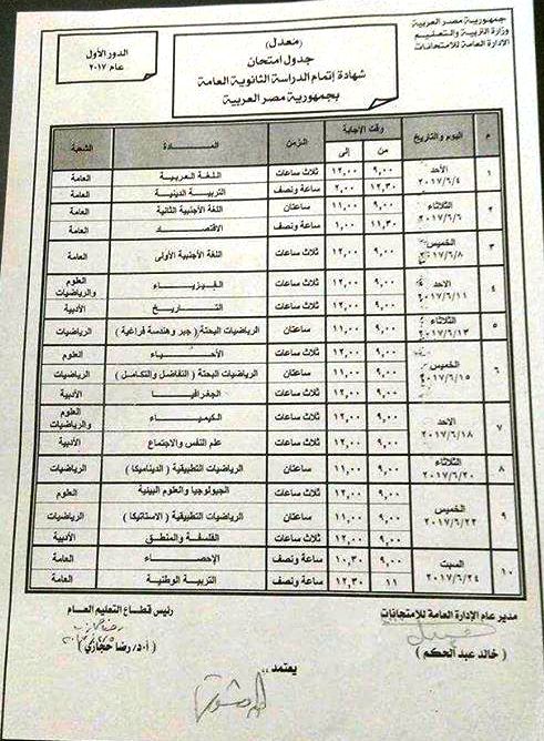 جدول امتحانات الثانوية العامة 2017 المعدل بعد اعتماده من وزارة التربية والتعليم في مصر نجوم مصرية