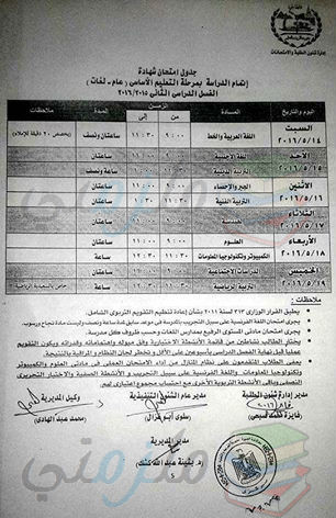 جدول امتحانات الشهادة الاعدادية الترم الثانى 2016