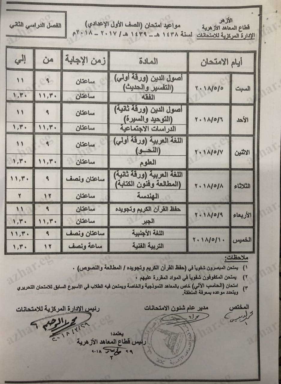 الان جدول إمتحانات الصف الاول الاعدادى الازهرى 2018 أخر العام