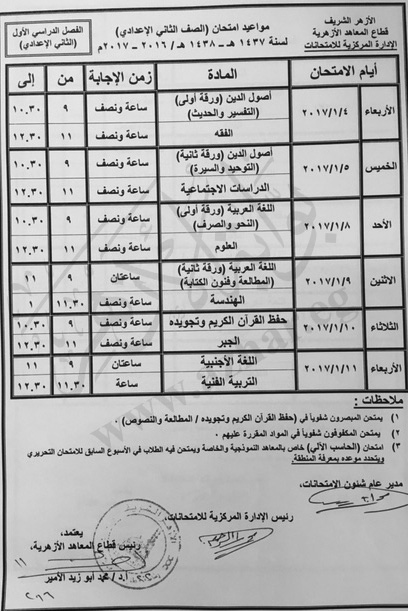 جدول امتحانات الترم الاول 2016 الصف الثالث الاعدادى الازهرى كايرو نيوز