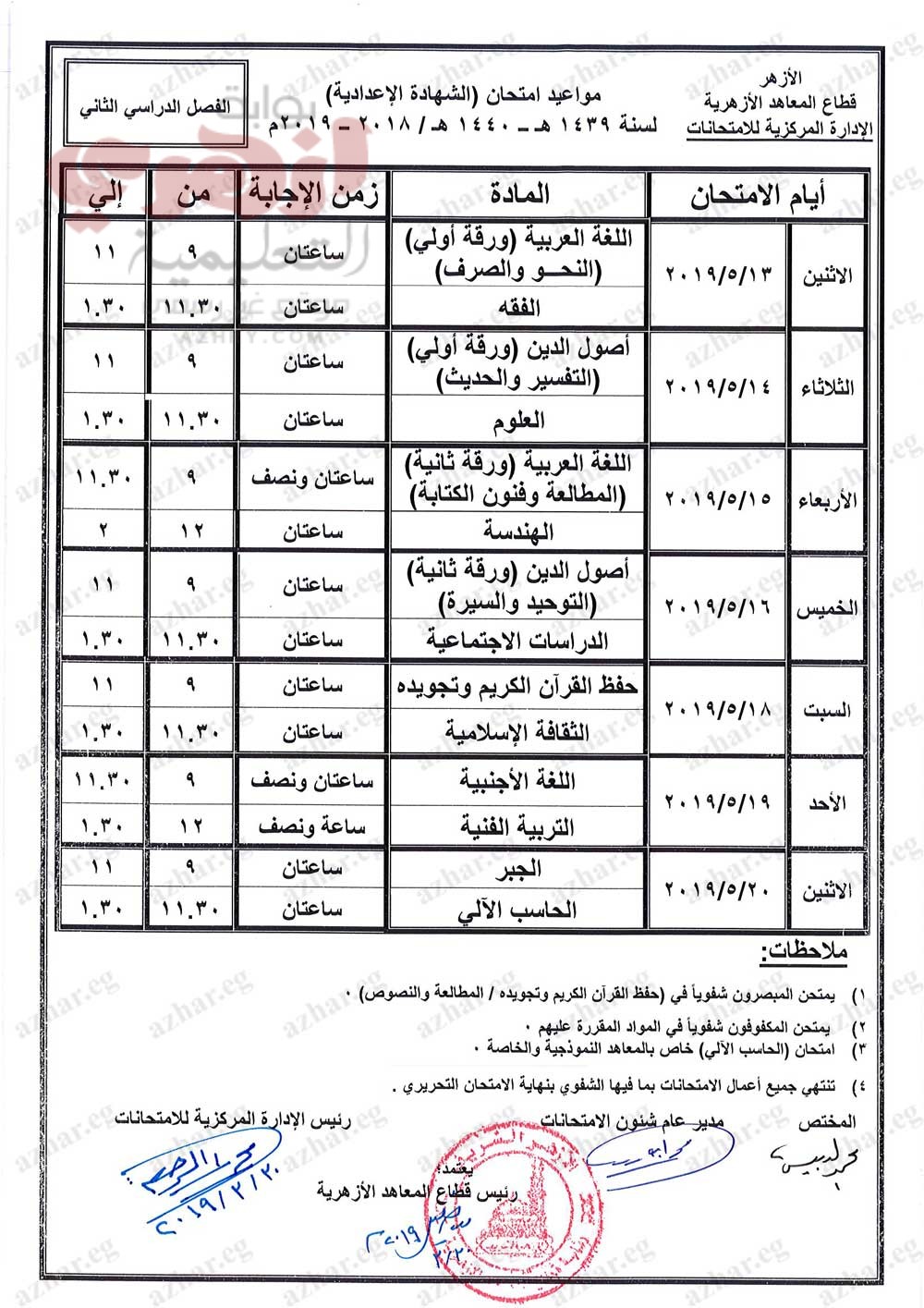 جدول امتحانات نصف العام 2019 الصف الثانى الإعدادي الازهرى امتحانات الترم الأول في جميع المعاهد الأزهرية المرحلة الابتدائية الإعدادية الثانوية قطاع المعاهد الأزهرية جريدة الفراعنة
