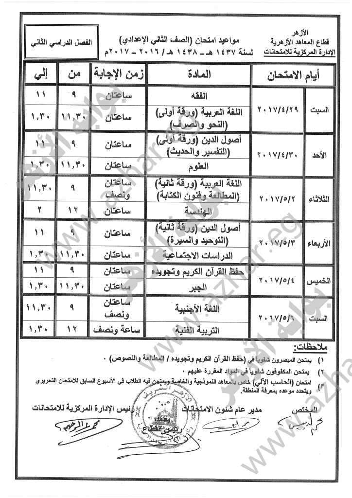 جدول امتحانات الصف الثاني الاعدادي الازهري المعدل الفصل الدراسي الأول 2016 م نجوم مصرية