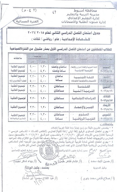 جدول امتحانات الصف الثالث الاعدادي اسيوط الترم الاول 2015