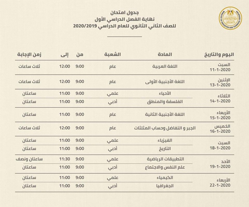 جدول إمتحانات الصف الثانى الثانوى الترم الأول 2020 نصف العام