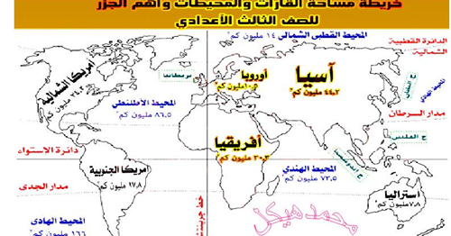 خريطة مختصرة لكل مساحة القارات والمحيطات واهم جزر منهج الثالث الاعدادى ترم اول 2017 للاستاذ محمد هيكل