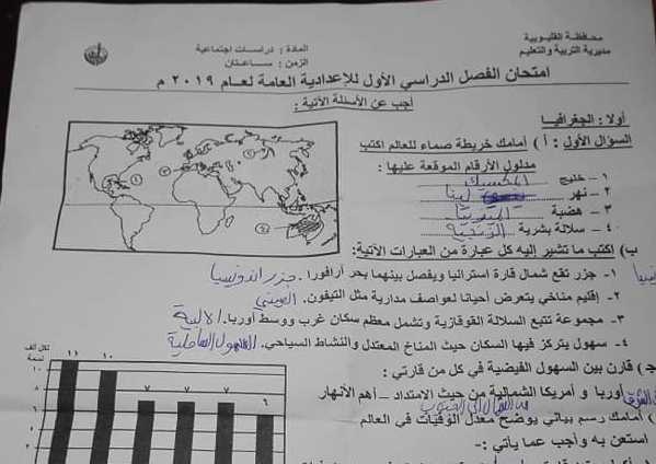 ورقة امتحان الدراسات الاجتماعية للصف الثالث الاعدادي ترم اول 2019 محافظة القليوبية