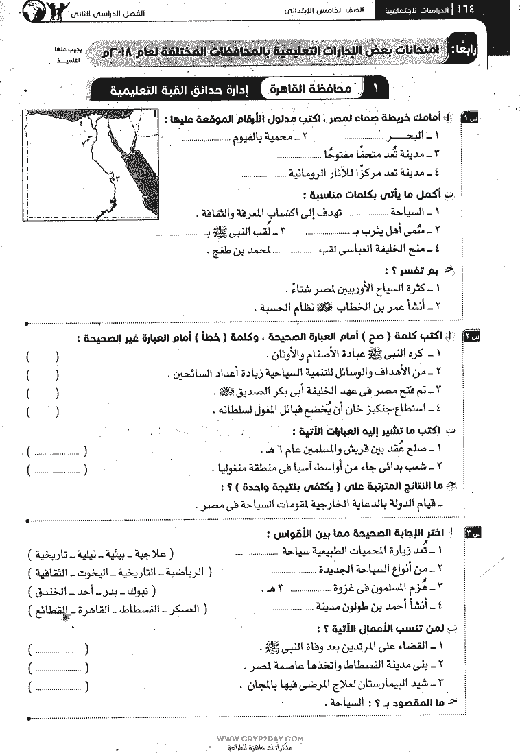 امتحانات سلاح التلميذ فى الدراسات الاجتماعية للصف الخامس الابتدائى الترم الثانى 2019