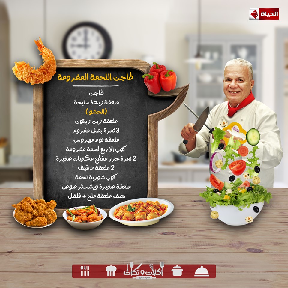 طريقه عمل طاجن اللحمه المفرومه بطريقه الشيف حسن من برنامج اكلات وتكات على قناه الحياة الشيف حسن