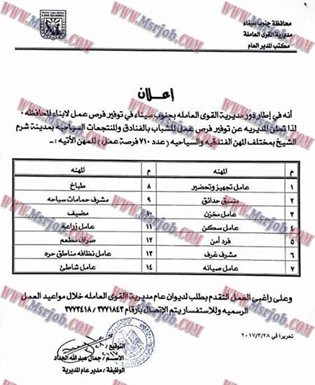 وظائف وزارة القوى العاملة للعمل بشرم الشيخ للشباب 2017
