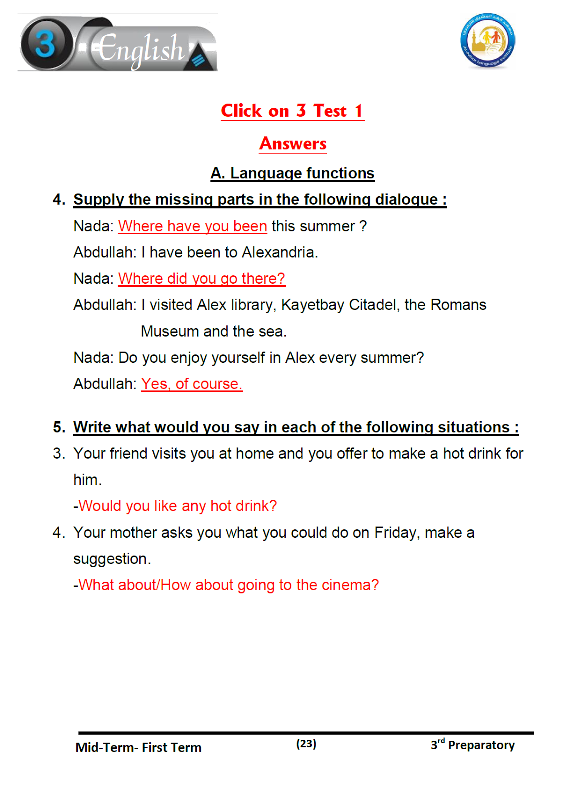 مراجعة نهائية انجليزي شاملة الاجابات 3 اعدادي 2018 ترم اول بوابة كويك لووك العربية