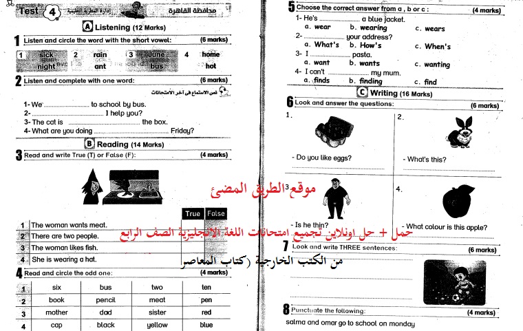 امتحانات المعاصر فى الانجليزى للصف الرابع الابتدائى الترم الاول 2017