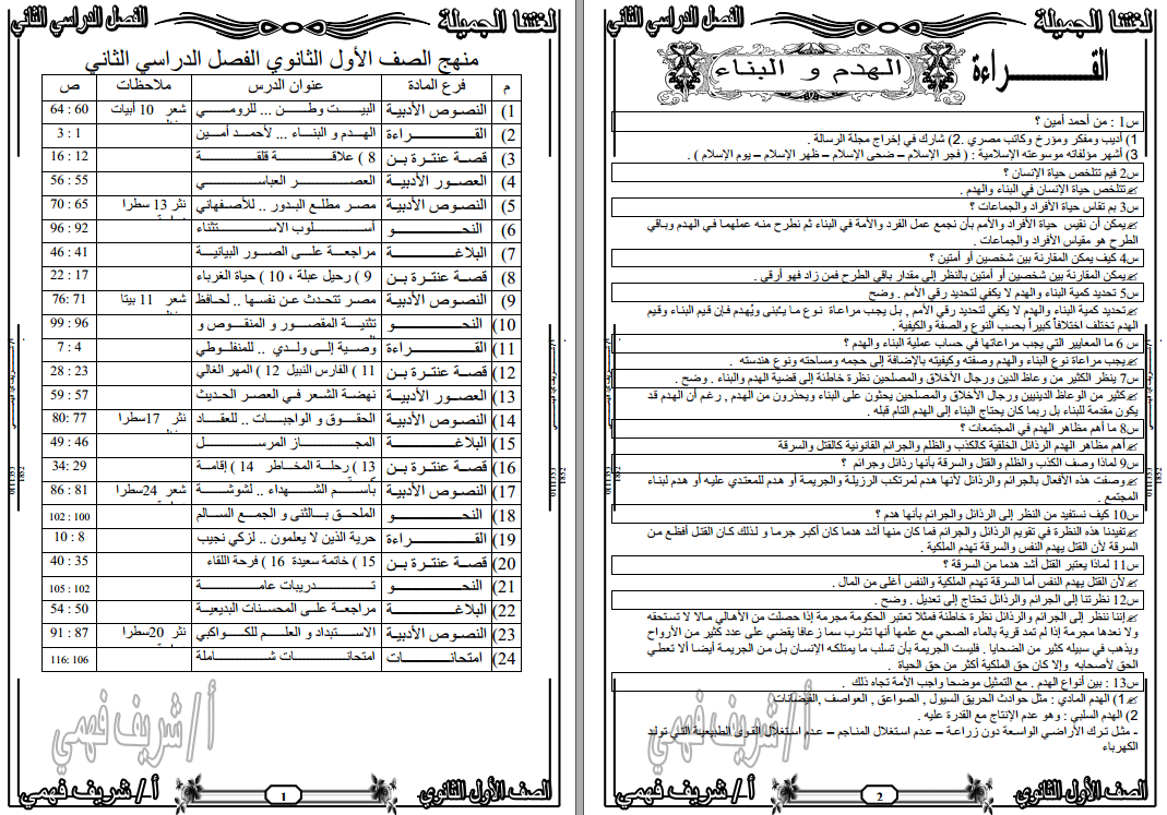 منهج اللغة العربية للصف الاول الثانوى الفصل الدراسى الاول مذكرات شرح ومراجعات وامتحانات تنسيق خرافى