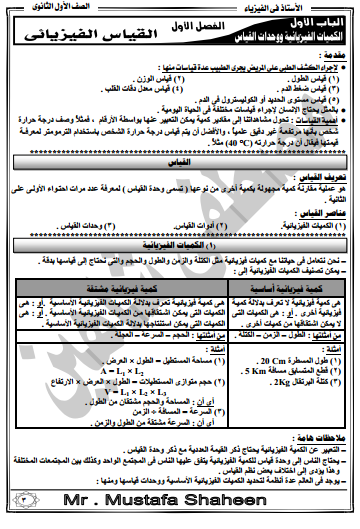 مذكرة فيزياء للصف الأول الثانوى الترم الاول 2015 منهج مطور للاستاذ مصطفى شاهين