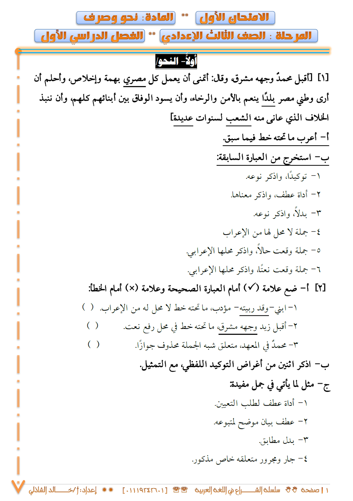 مذكرة اللغة العربية للثالث الاعدادى ترم اول 2019 للاستاذ اسامة مفيد