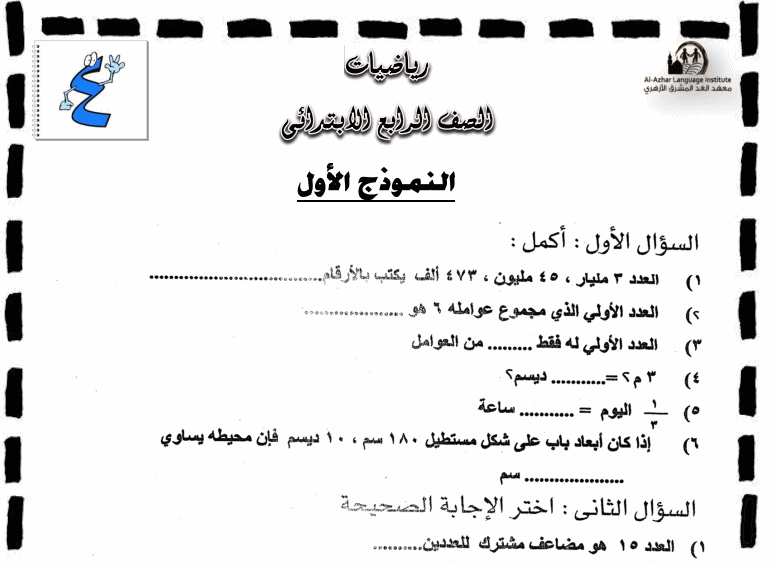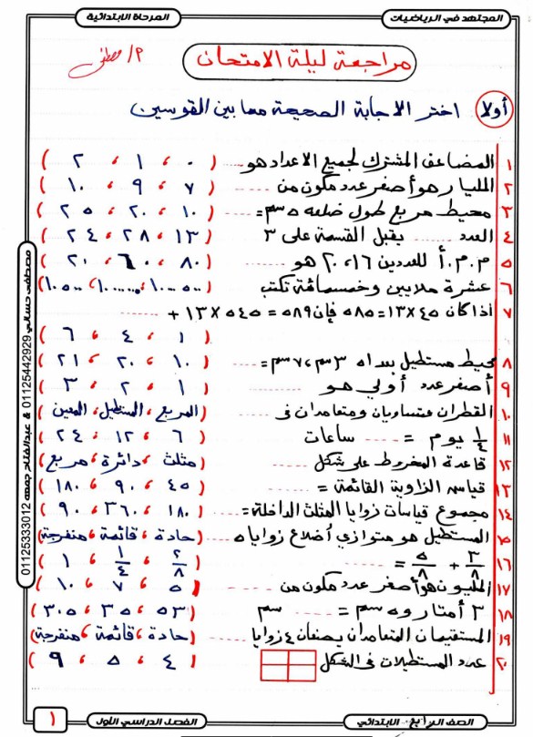 مراجعة ليلة الامتحان الرياضيات الصف الرابع الابتدائى طالب