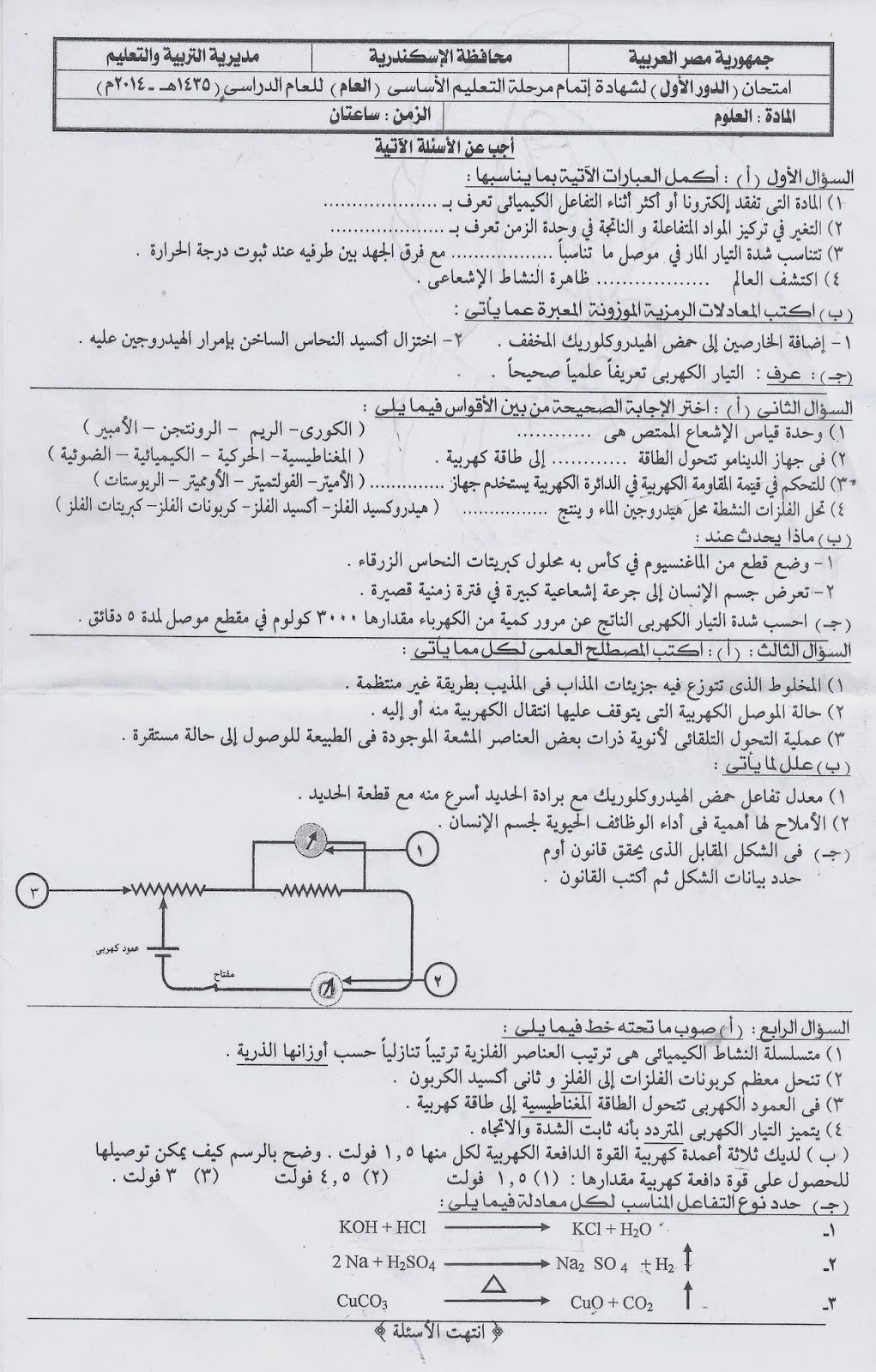 Adz4u Omniawagdy ننشر امتحان العلوم للصف الثالث الإعدادى آخر العام بالإسكندرية الدور الأول 2014 م