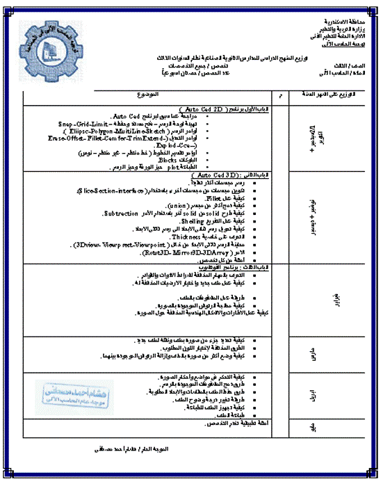 خريطة توزيع منهج الحاسب الالى للمدارس الثانوية الصناعية نظام 3 سنوات للترم الثانى 2015