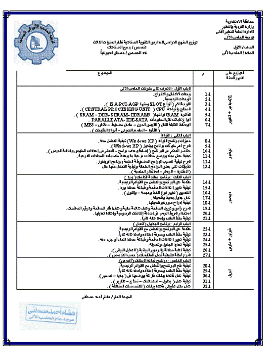 خريطة توزيع منهج الحاسب الالى للمدارس الثانوية الصناعية نظام 3 سنوات للترم الثانى 2015