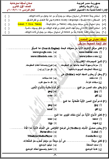 نماذج استرشادية للحاسب الالى للصف الاول الثانوى الترم الثانى 2015 بالاجابات كاملة