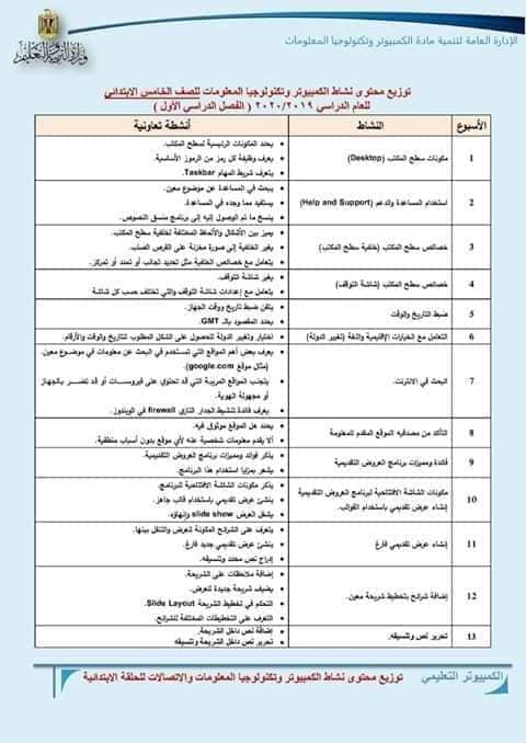 توزيع منهج الحاسب الالى للصف الخامس الابتدائى الترم الاول والثاني 2020 نظرى وعملى