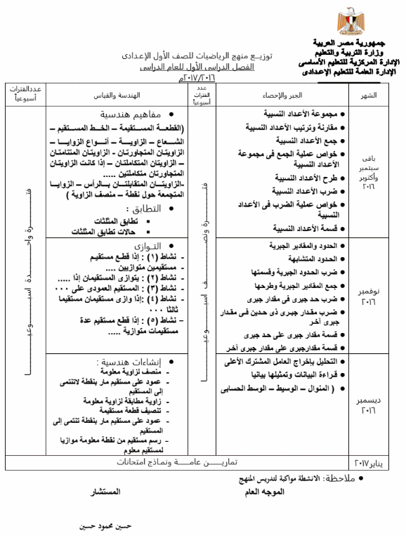 توزيع منهج الرياضيات للصف الاول الاعدادى الترم الاول 2017 وزارة التربية والتعليم