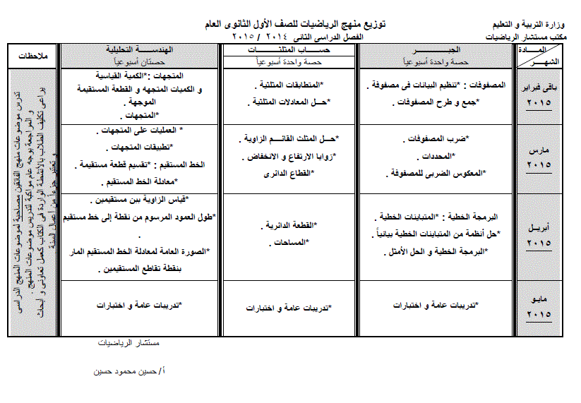 رياضيات توزيع منهج الصف الاول الثانوي الجديد الترمين 2015 2016 الرياضيات اول ثانوى المنهج المصري