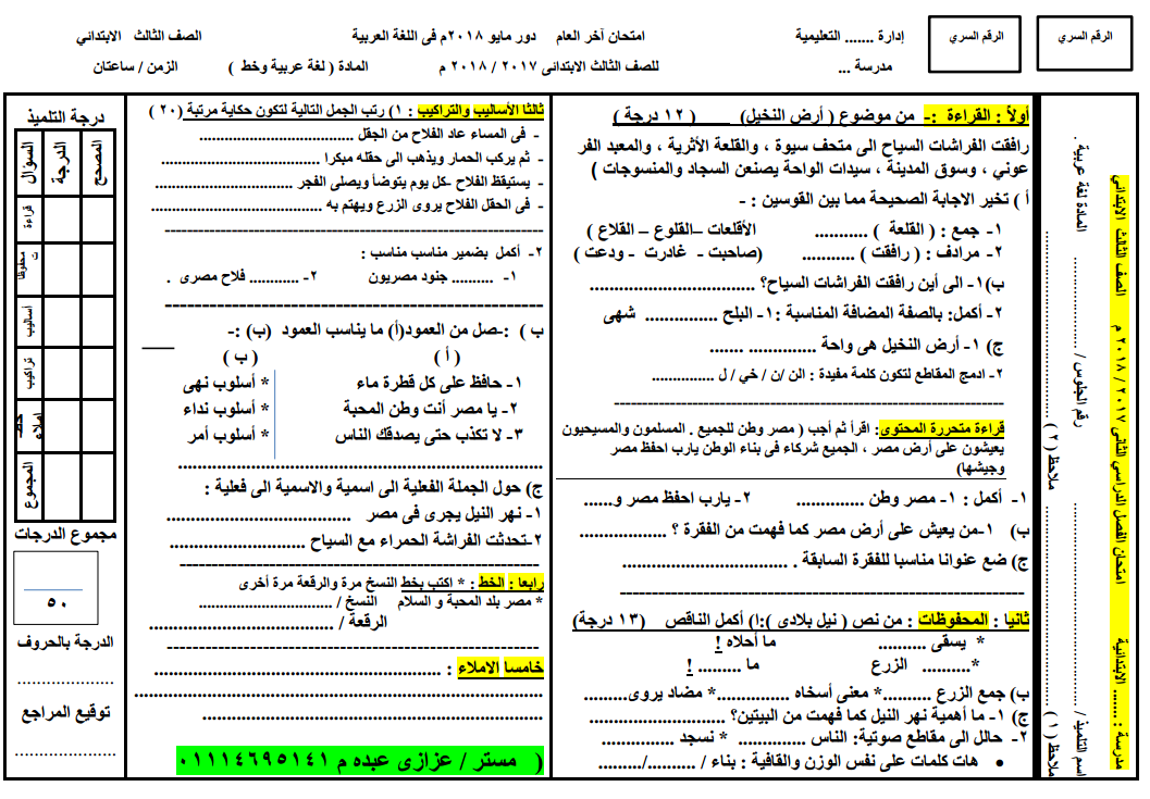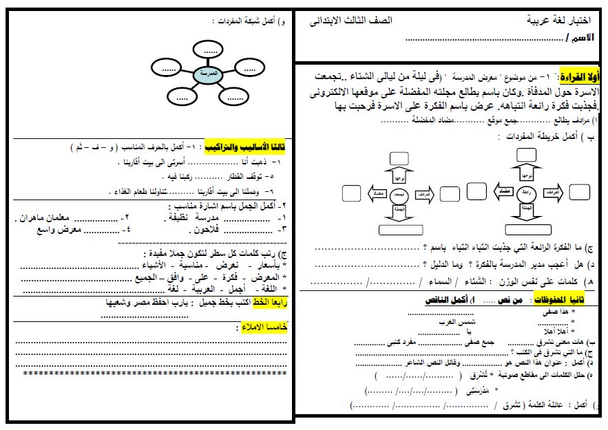 امتحان لغة عربية متوقع للصف الثالث الابتدائى ترم اول 2019 للمراجعة النهائية