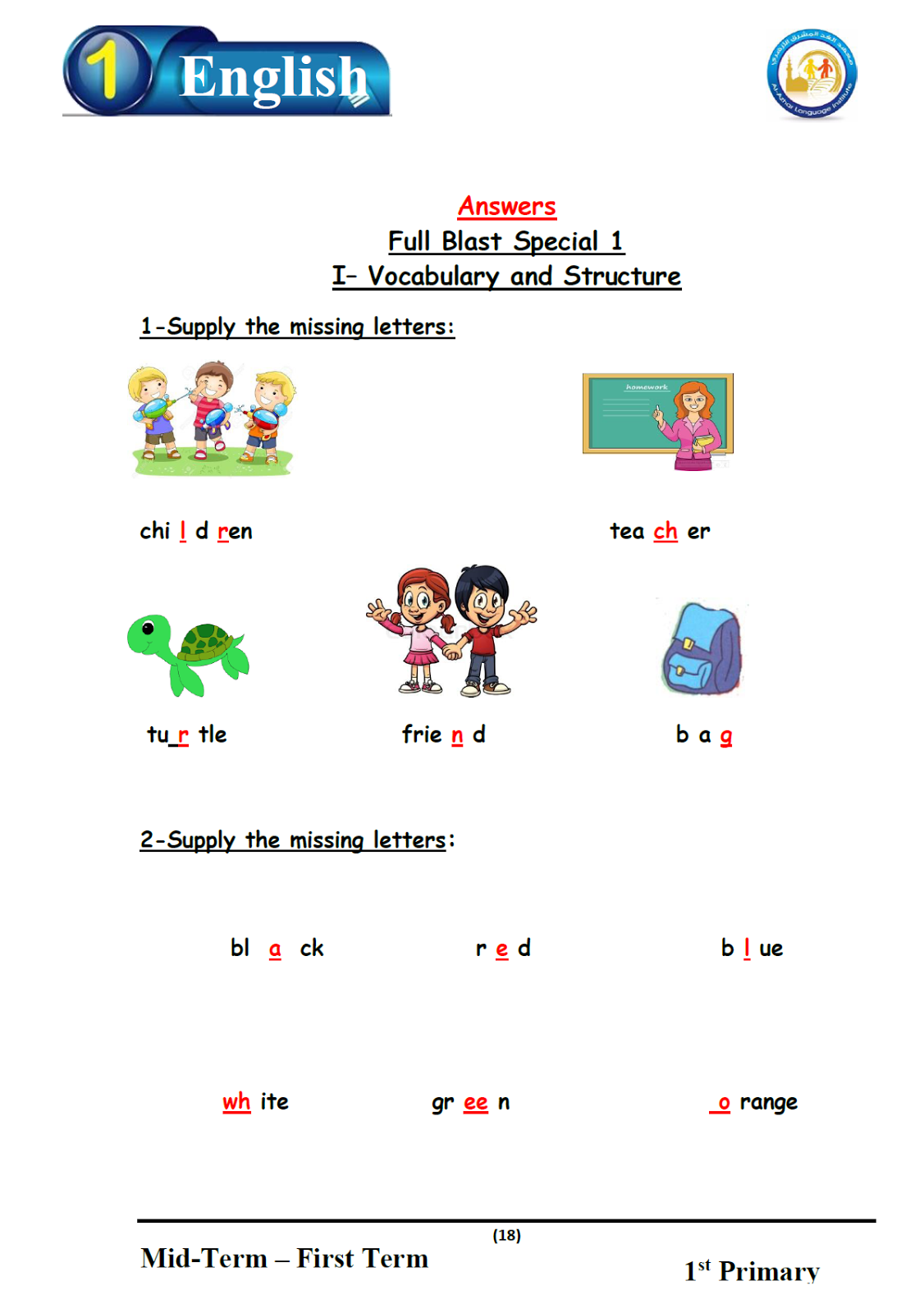 مذكرة لغة انجليزية للصف الاول الابتدائي ترم اول 2018