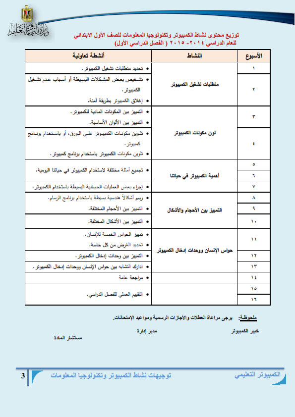 توزيع نشاط الكمبيوتر وتكنولوجيا المعلومات منهج الكمبيوتر 1 ابتدائى الترمين 2015